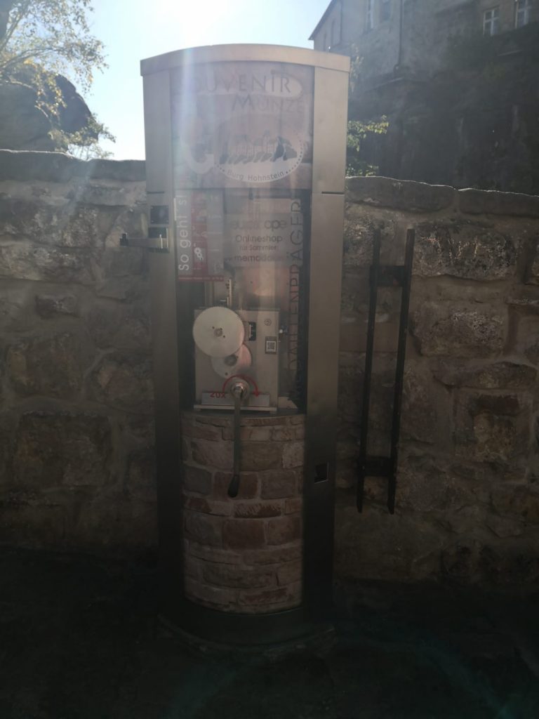Vom Parkplatz den Weg nach oben. Nach dem Torbogen befindet sich der Automat auf der rechten Seite, gut sichtbar. Er ist frei zugänglich.