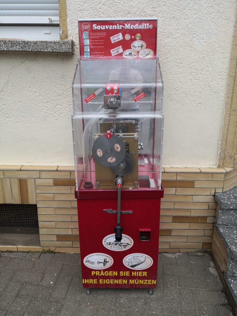 Der Automat befindet sich auf der Kastellauner Str. vor der Hauswand. Dort kann man auch 10 Cent Münzen pressen.