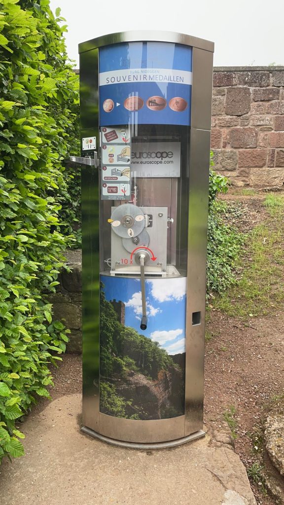 Ca. 100 m vor der Burg befindet sich ein Parkplatz. Nach den zweiten Torbogen befindet sich der Automat gerade aus.