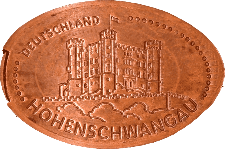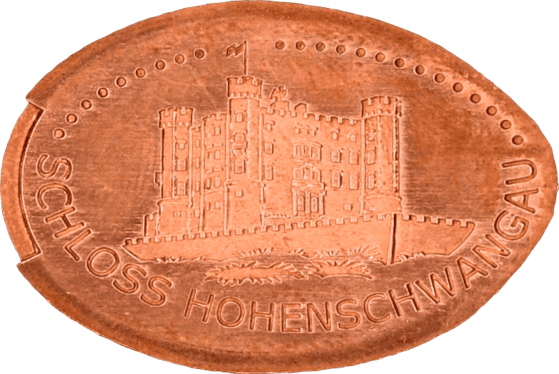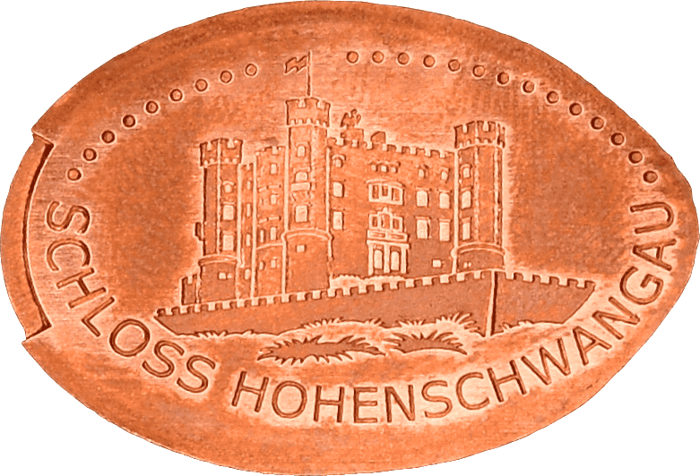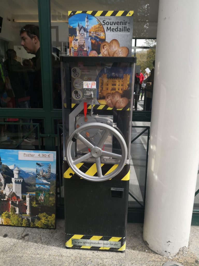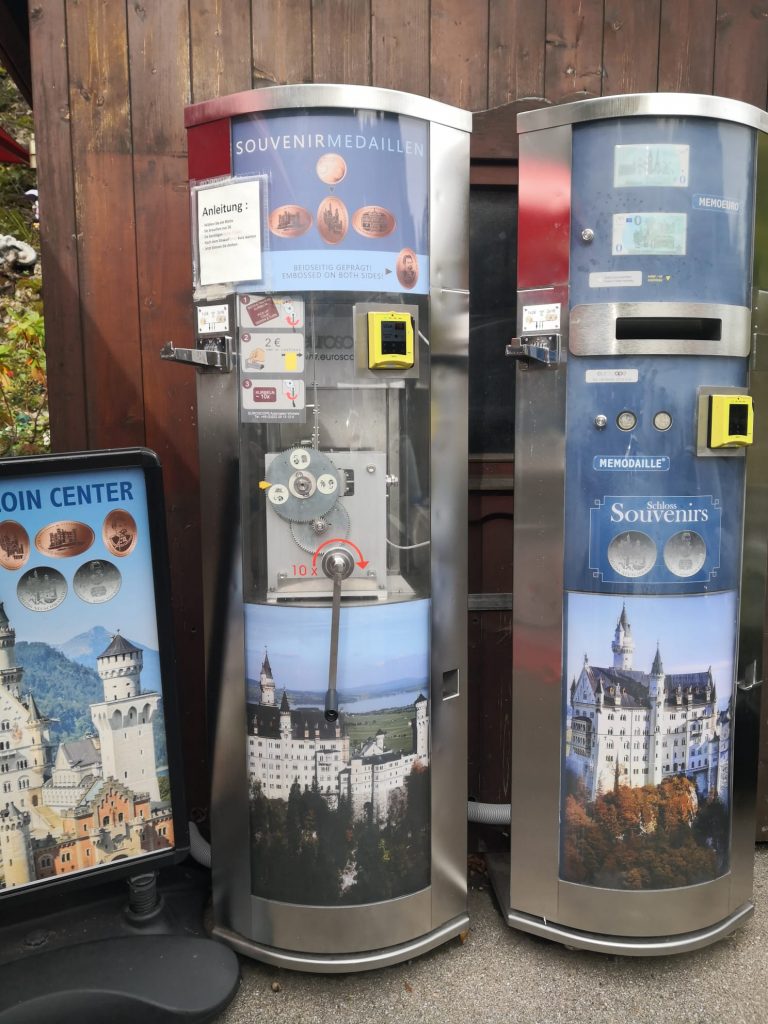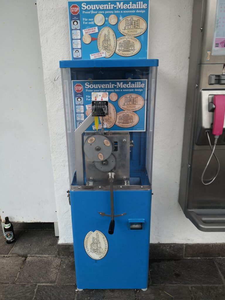 Einer steht vor dem Königsschlösser Museum. Der zweite steht rechts neben der Alp Stube. Eine Münze kostet 2 Euro und man braucht keine 5 Cent. Es wird auch die Rückseite gepresst. Der dritte Automat steht Links vor der Info.